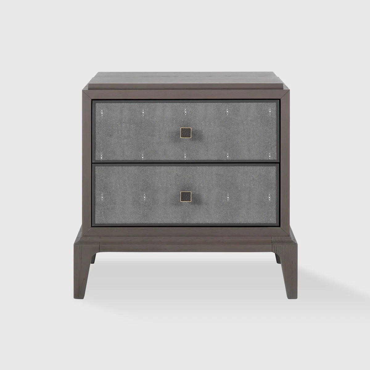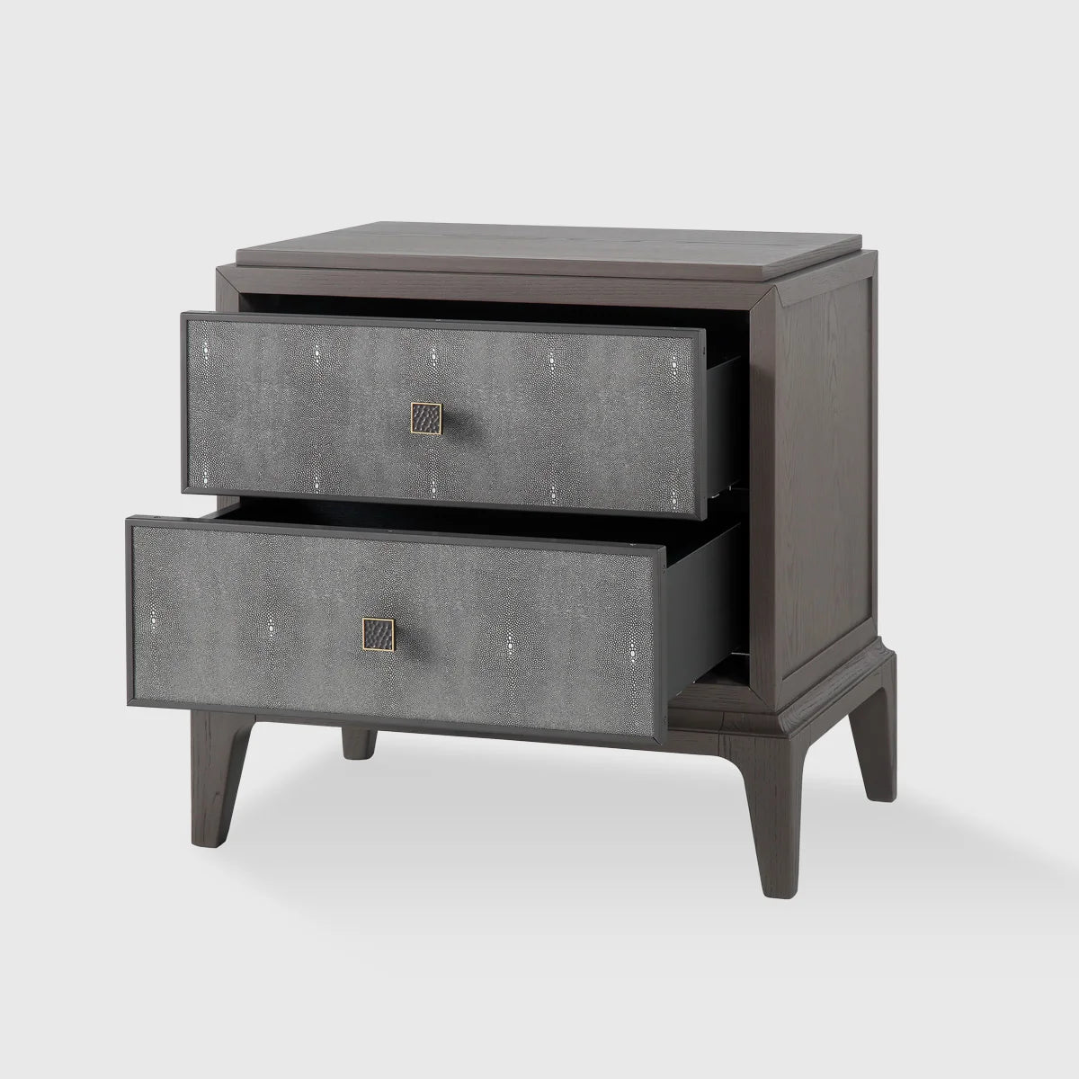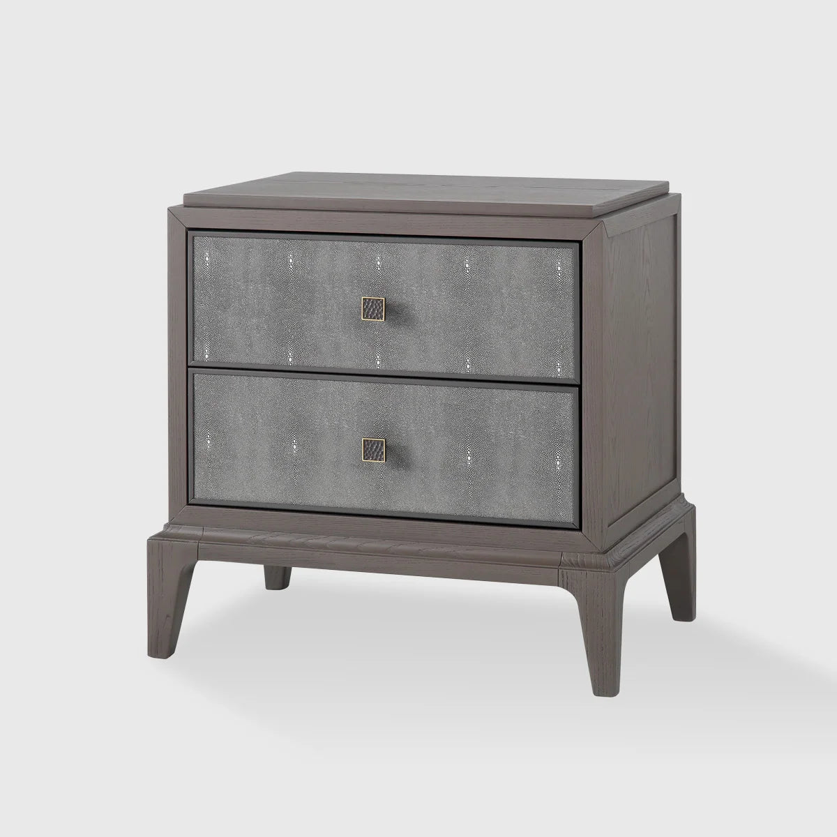 This beautifully crafted nightstand features a warm mocha finish that adds a touch of richness to any interior. The grey faux shagreen drawer fronts provide a striking contrast, delivering a sense of texture and refinement that elevates the piece. The combination of these finishes creates a timeless aesthetic that works seamlessly in modern and classic settings alike.