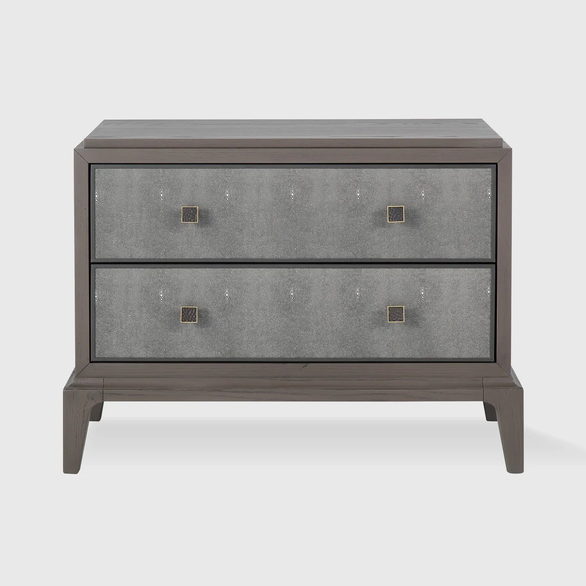 The Astoria Nightstand Large in Macchiato with Grey Faux Shagreen Fronts is a statement of timeless elegance and modern functionality. Perfectly balancing sophisticated design with practical storage, this piece is an exceptional addition to any bedroom or living space.