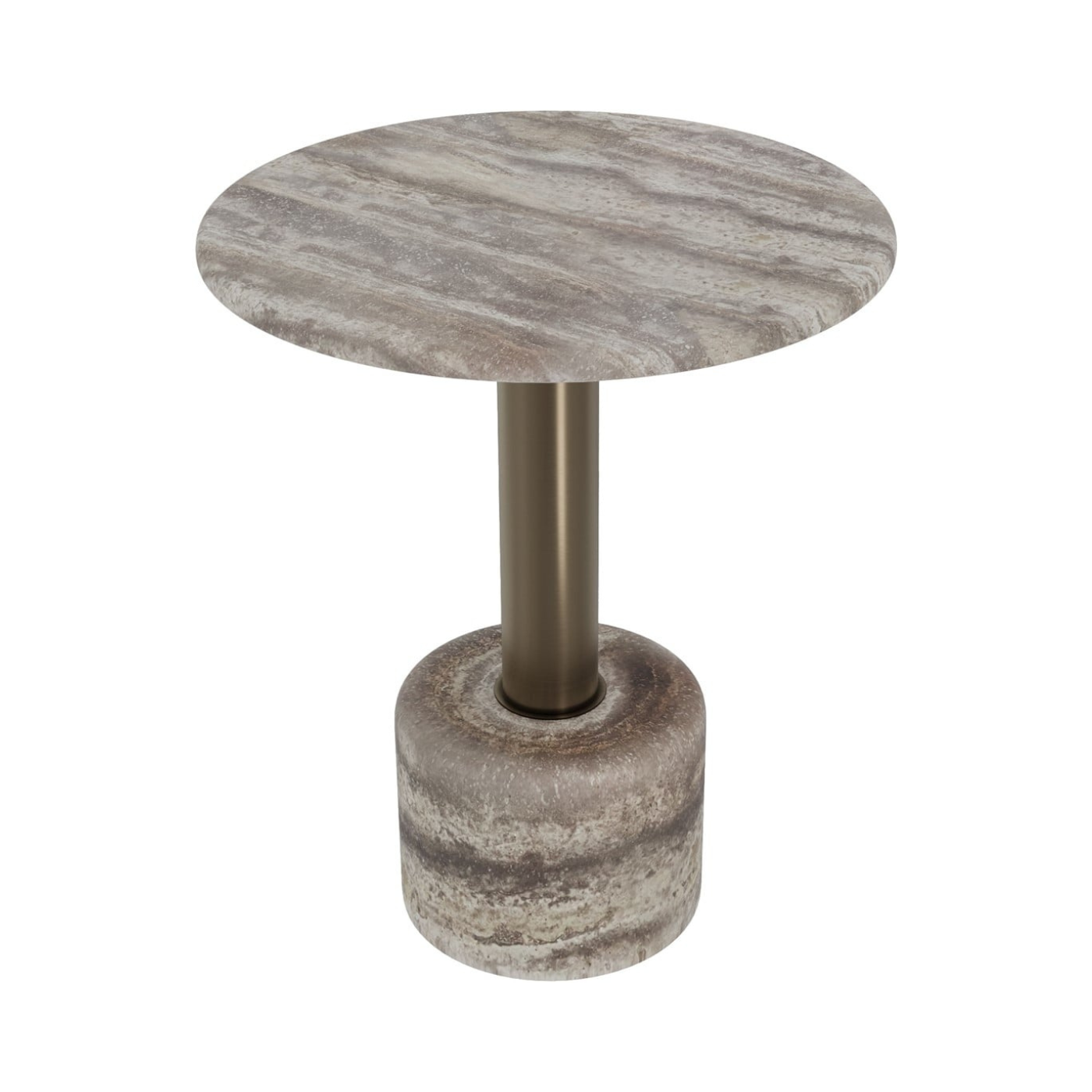 Elevate your decor with our Cooper Brushed Bronze Side Table featuring a luxurious grey travertine circular top. The brushed bronze accents add a touch of sophistication to any space. Each natural stone top is unique, with inherent vains and cracks that add character and beauty. Upgrade to the unparalleled quality of natural stone.