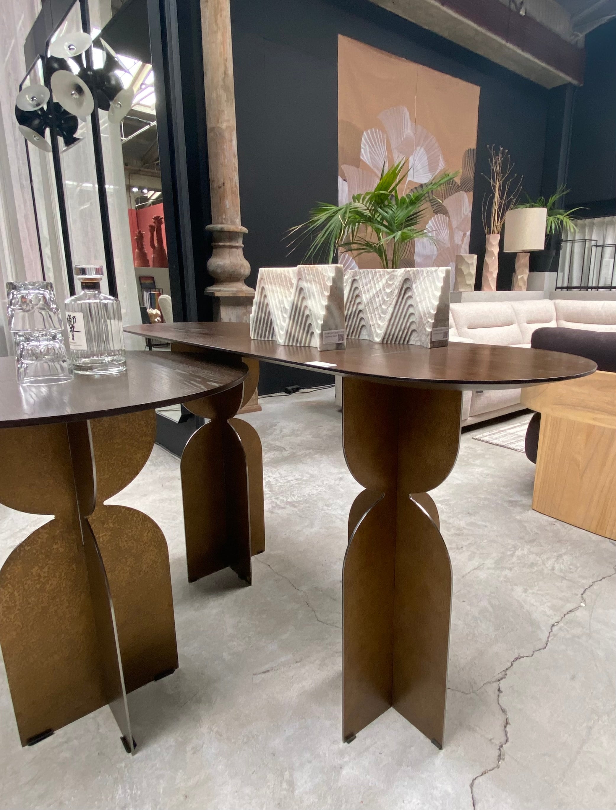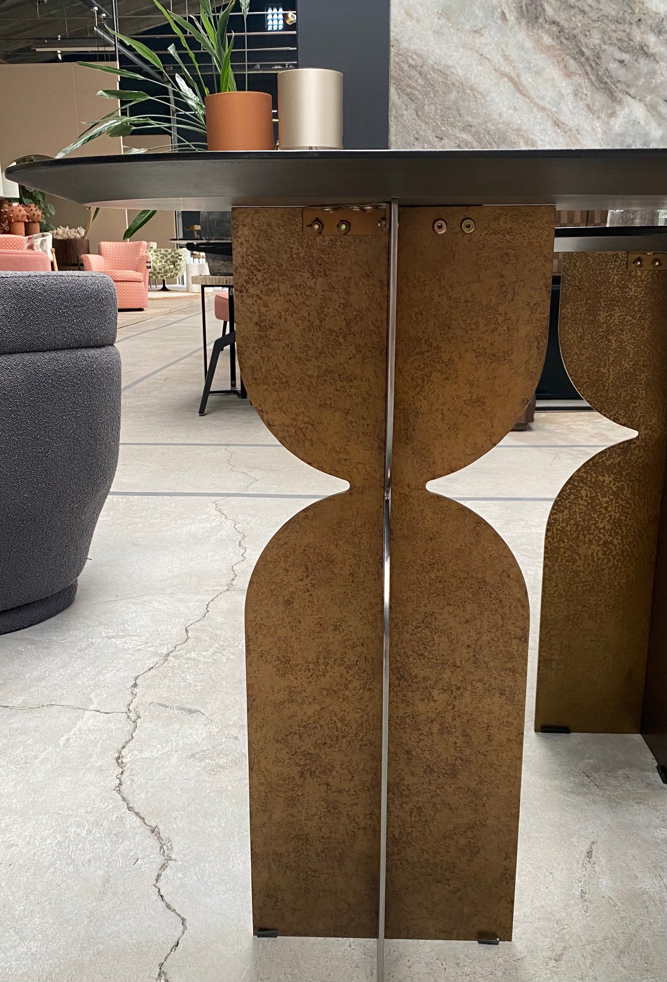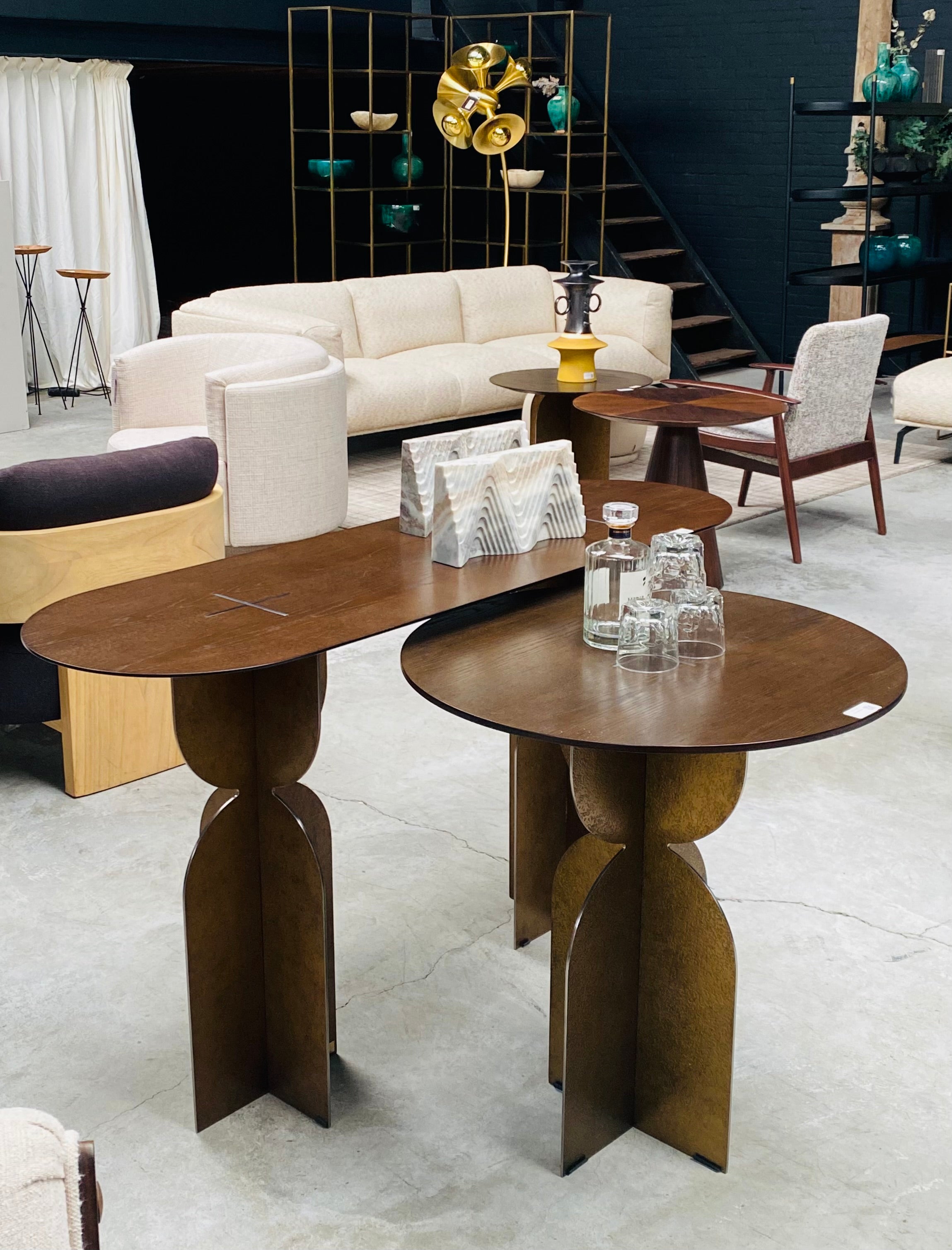 The Ray Bronze Steel Console Table by Versmissen blends classic craftsmanship and modern design for a timeless piece. Sturdy yet stylish, the bronze steel base and oval brown oak wood top make the perfect combination of durability and luxury. A unique base design adds a contemporary touch that elevates this piece to an exclusive level.