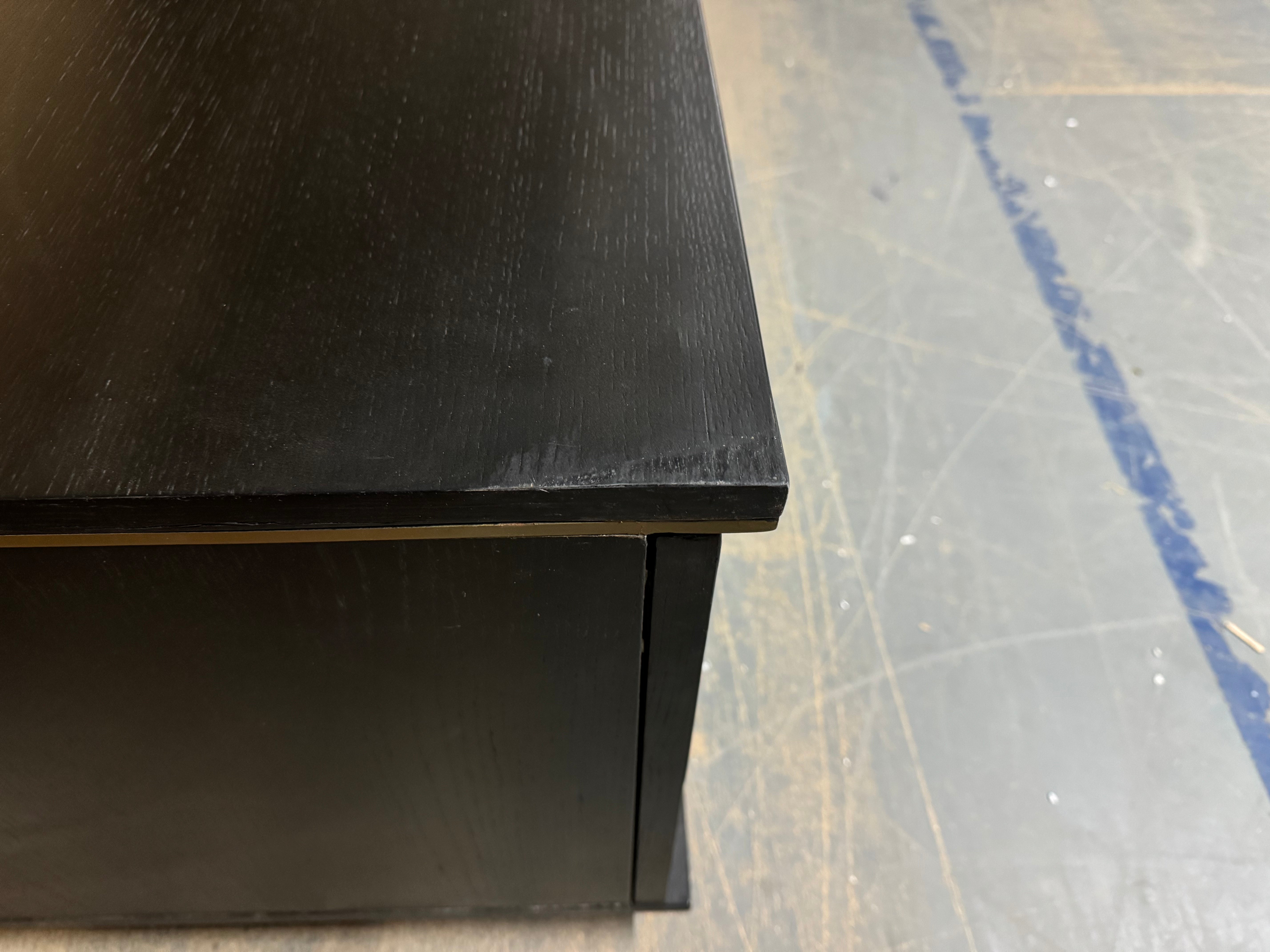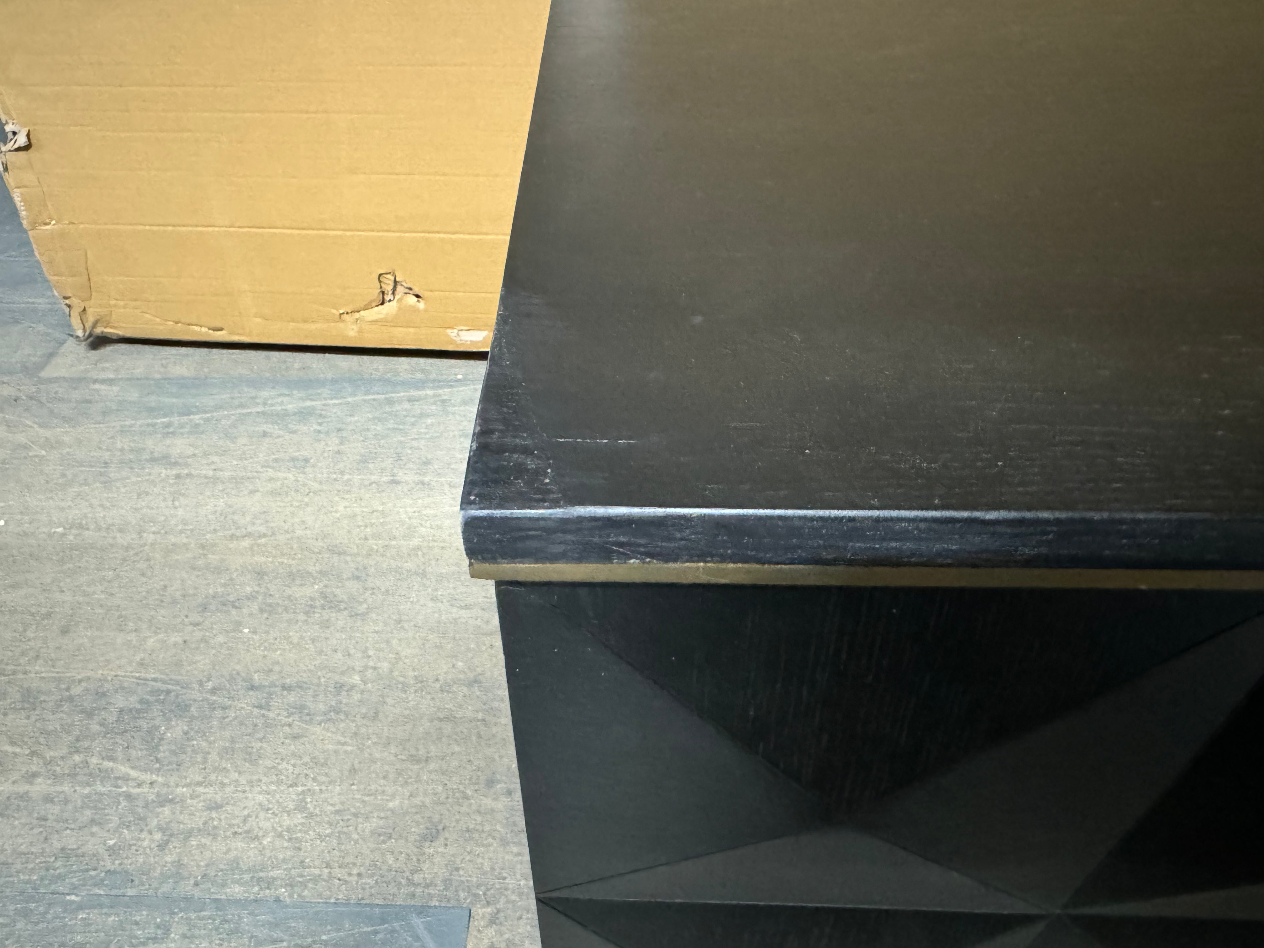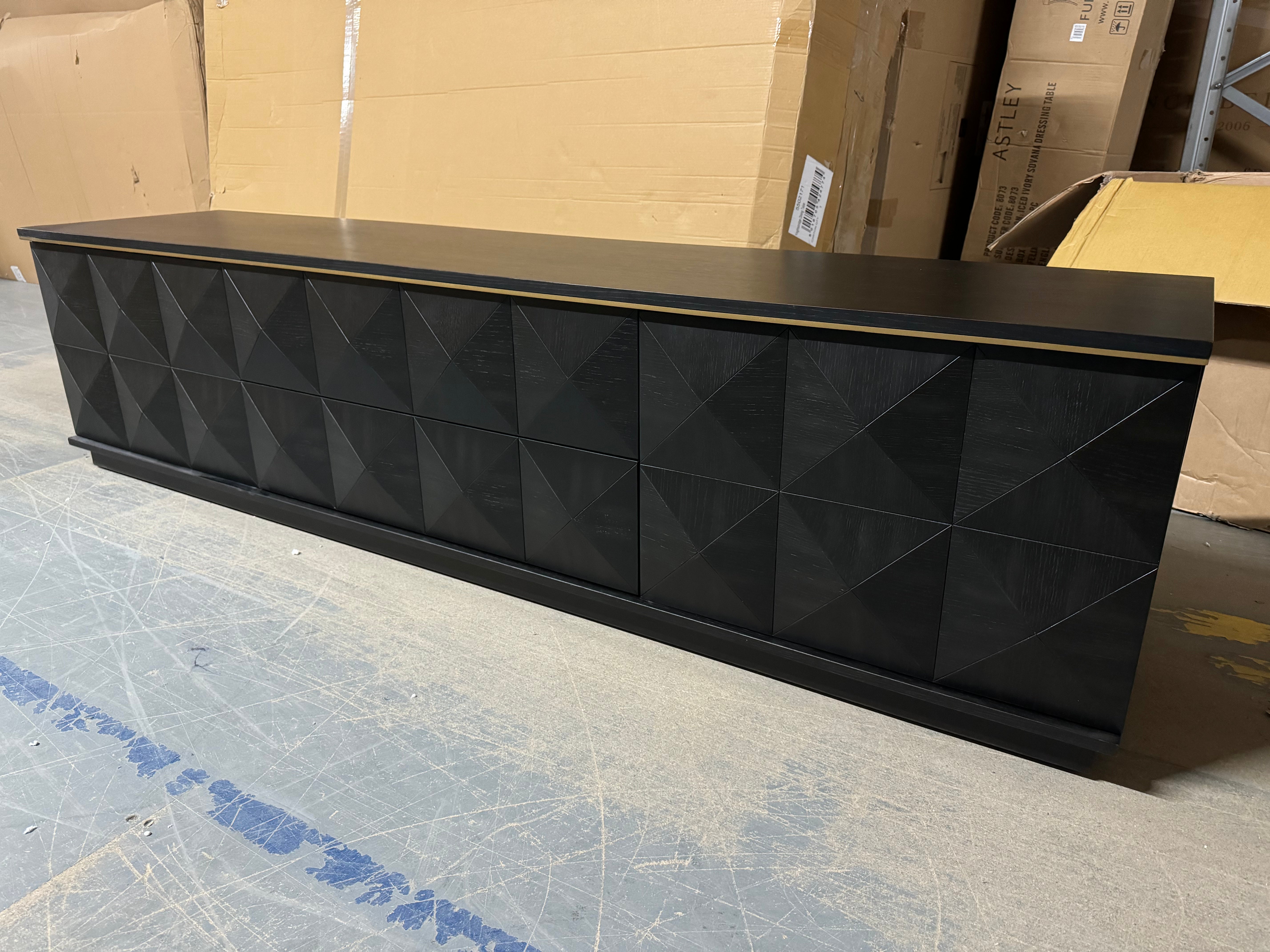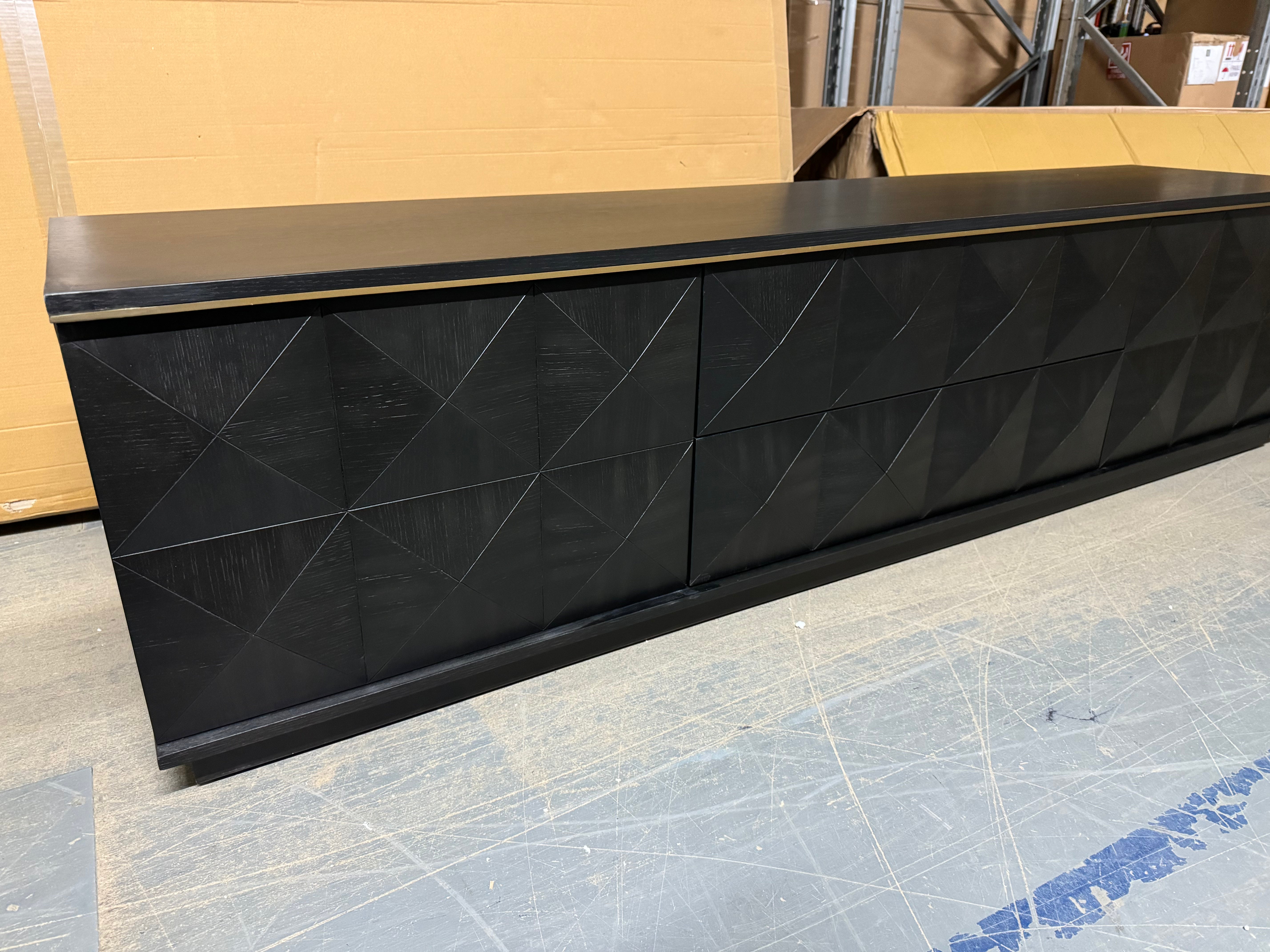 The Diamond media unit features an oak veneer top and frame made from renewable rubberwood. Its two central drawers are flanked by cupboards, all discreetly concealed by the geometric facade. The black finish is contrasted by a gold trim at the top.