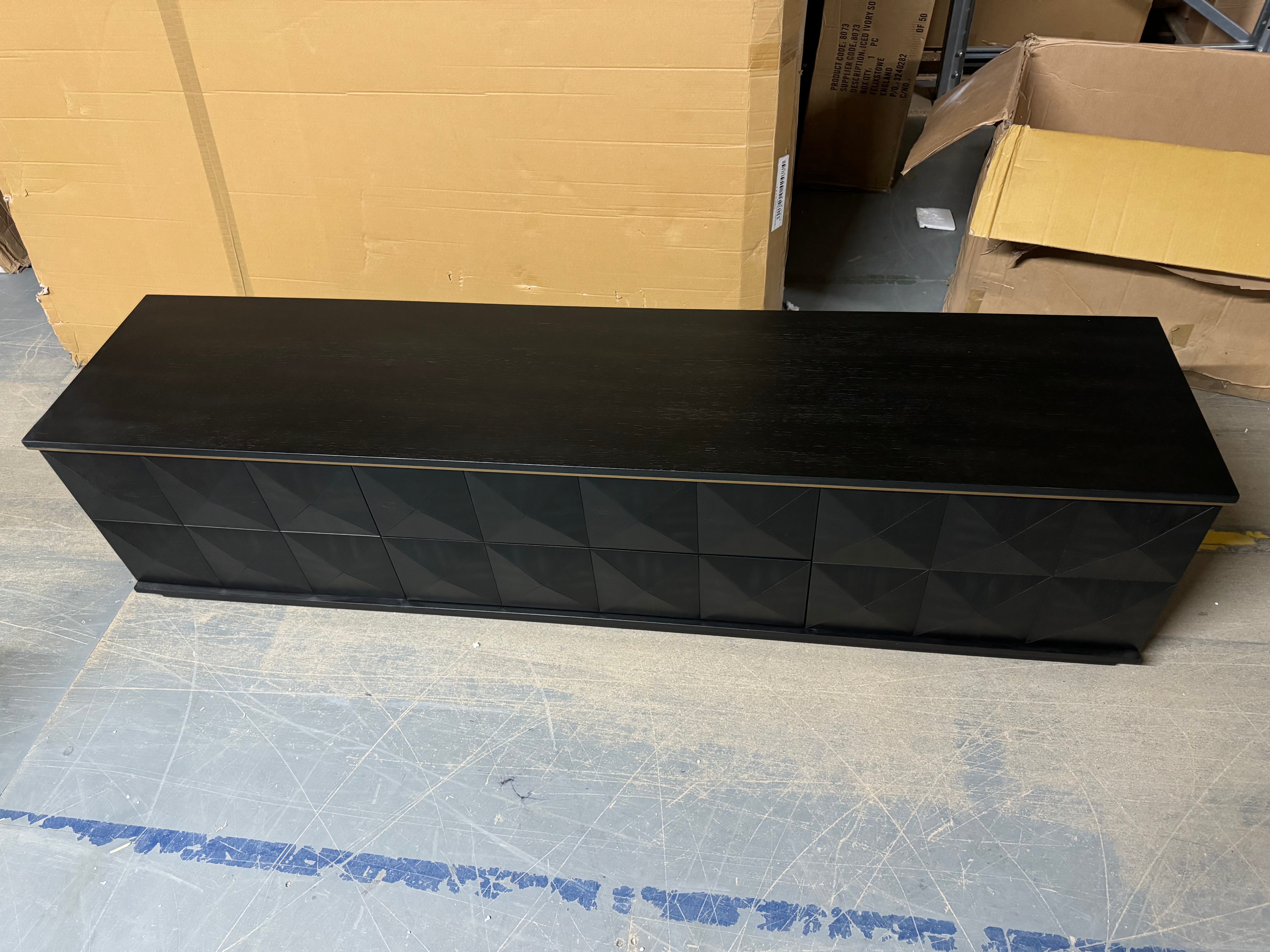 A large media unit crafted from dark wood with a modern geometric design.