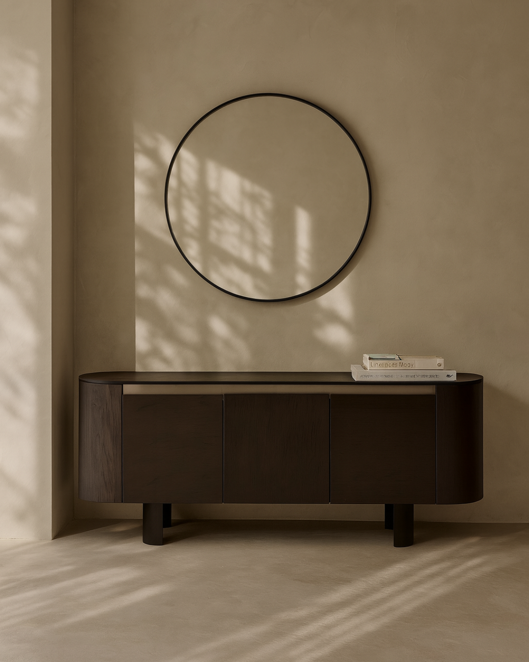 Elevate your space with the refined elegance of the Salvo Buffet, a perfect fusion of modern sophistication and natural warmth. Crafted in rich Smoke Oak, its deep, textured grain exudes organic beauty, while the sleek stainless steel detailing adds a contemporary edge. Resting on sturdy black powder-coated legs, this statement piece balances strength and style, creating a timeless aesthetic that complements both minimalist and luxurious interiors.