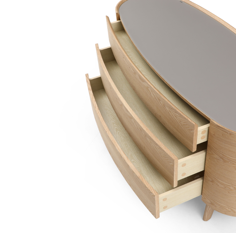 The Weston Dresser is an exquisite embodiment of refined elegance, characterised by its soft and inviting rounded lines that exude a sense of comfort and sophistication. Its oval taupe smoke glass top adds a distinctive touch, showcasing a harmonious fusion of classic form and contemporary design. Drawing inspiration from Scandinavian influences, the dresser seamlessly blends minimalism with functionality, offering a fresh and uncluttered aesthetic. Crafted with meticulous attention to detail, the dresser features a rich ash oak veneer finish that enhances its natural beauty while providing durability. The addition of a taupe glass top not only complements the piece's aesthetic but also adds an element of practicality, making the Weston Dresser a versatile and captivating centrepiece for any interior space.